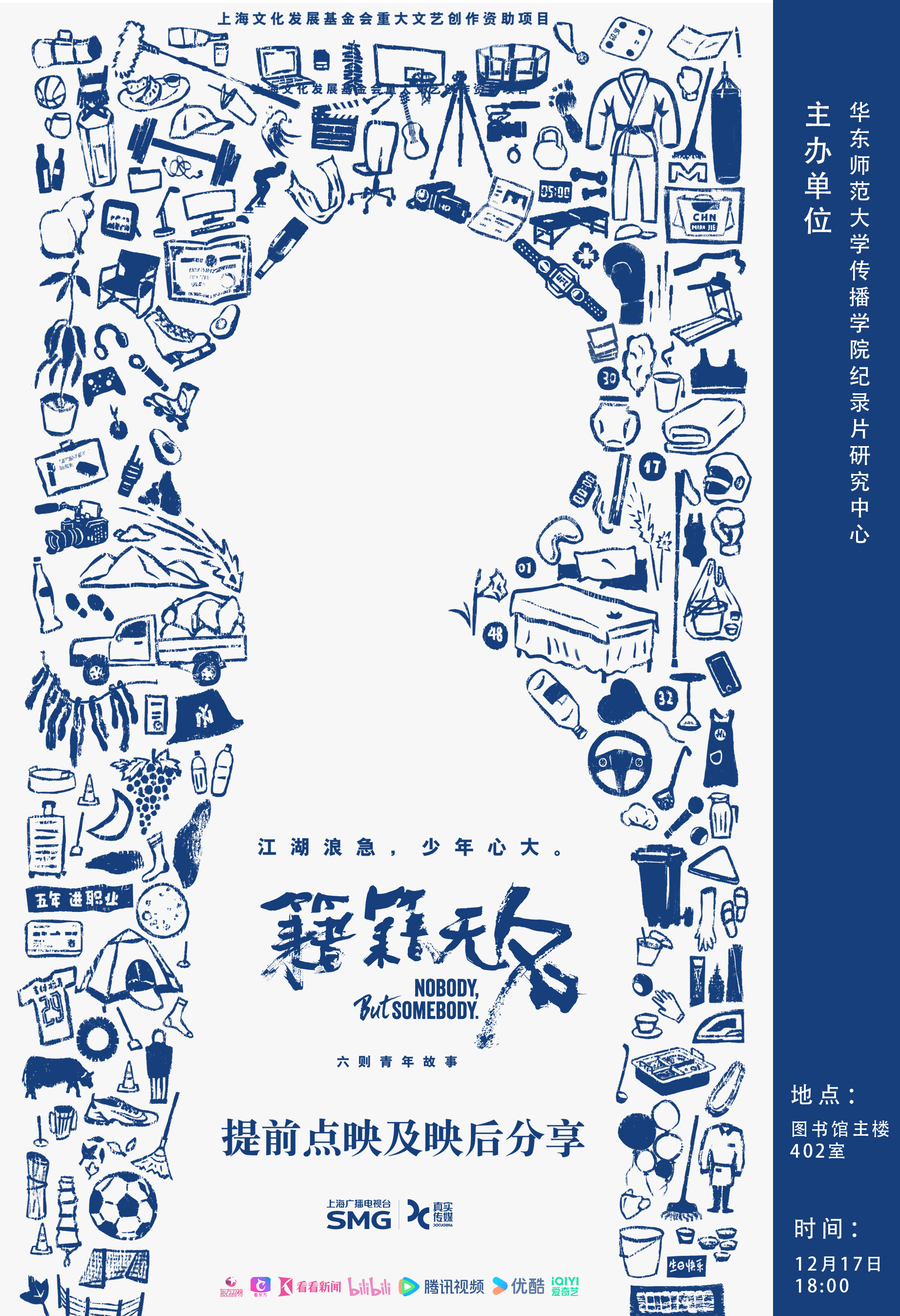 校园点映及映后分享会”将在华东师大闵行校区图书馆举行。本次活动将点映《籍籍无名》最终集《苏文源,天天开心!》,点映之后,本片导演还将和黑料718