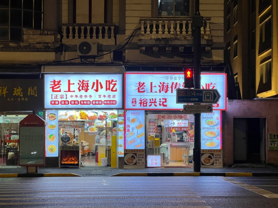 豫园作为上海知名旅游景点,周围早已形成规模化商业区,为迎合游客口味,老上海传统小吃是豫园商业区餐饮业的重要品类。一家店面,一个厨师和几个服务员,打着“老上海传统”的招牌,售卖生煎包、大排面等上海特色菜品,这似乎已成为豫园的代表性餐饮类别。在路红城更换LED“正宗老上海小吃”广告牌后不久,旁边的商家也换上了风格类似的新招牌。