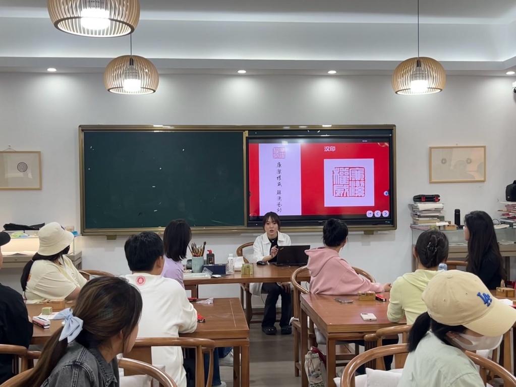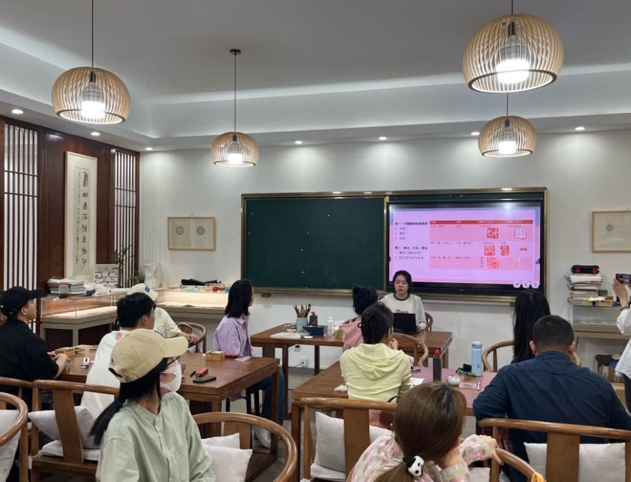 “铁笔刻廉韵,青石印初心”,一枚小小的篆刻印章兼具“章法”、内含万千气象。全体党员在美术学院党员程羽瑄同志的讲解下参观了美术学院师生所创作的篆刻作品,特别是参观了以“与党同行、廉洁权威、不负时代、觉醒时代”为关键词的党的二十大精神相关内容。一方方红色印章惠风在斯、图文并茂,涵盖古代文化、红色文化等内容,在方寸间构成了一幅中华历史长卷。与此同时,美术学院党员彭绮梦同志从篆刻的历史沿革、技法等方面讲解篆刻知识,并现场为党员们进行篆刻示范。