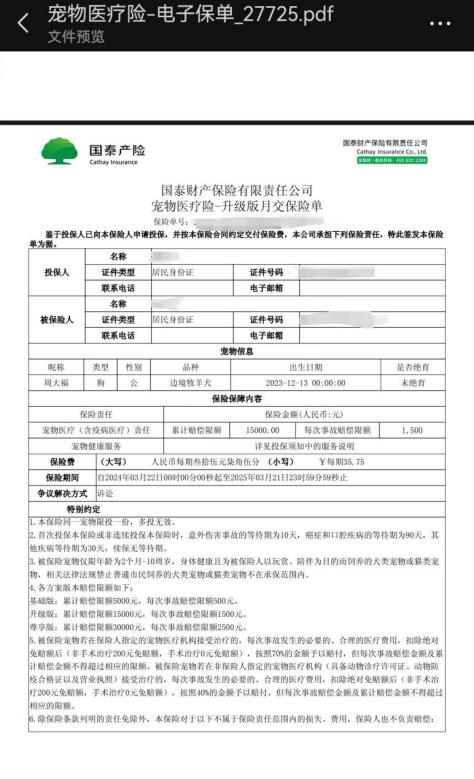 2024216日,周女士迎来了她人生中的第一只小狗,一只金色与白色相间的边牧犬,周女士为它冠以自己的姓,取名为周大福。2024313日,也是周大福满四个月的日子,周女士从小红书的一篇帖子上了解到宠物保险,动了给边牧周大福买保险的想法。对比了多个平台的宠物保险后,她选择了支付宝平台的国泰宠物保险。“同样的保险每个地区价格都不同,这款保险在南昌是每个月交3575,一个月后生效。”