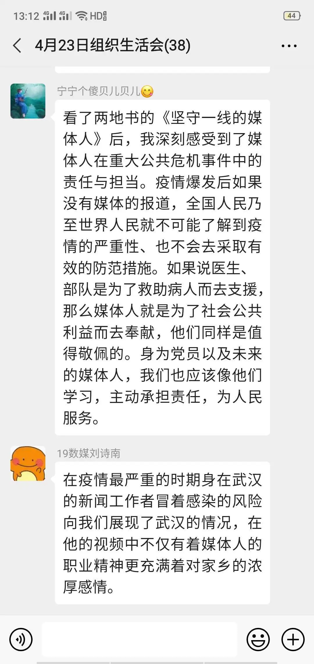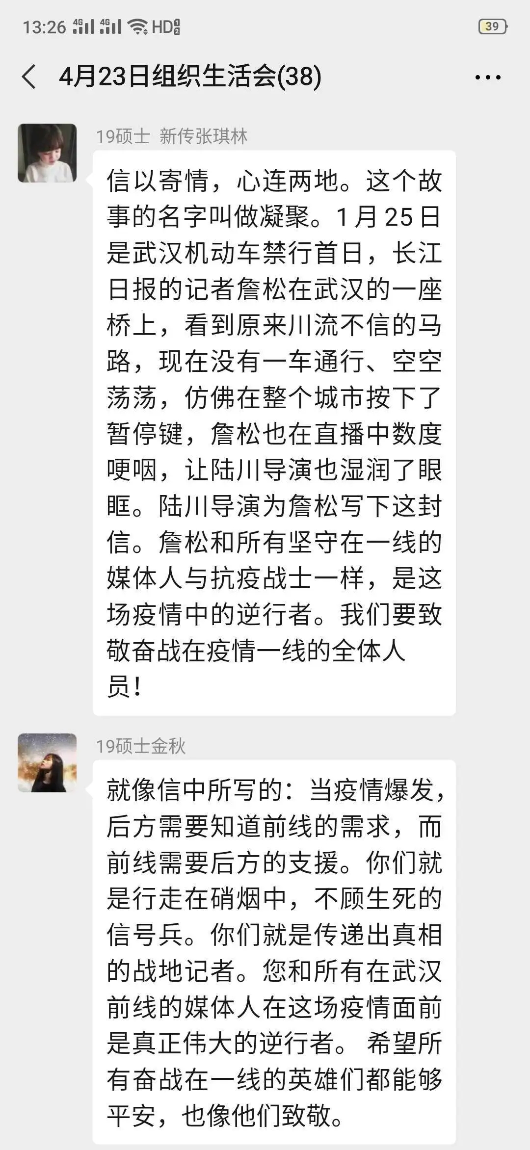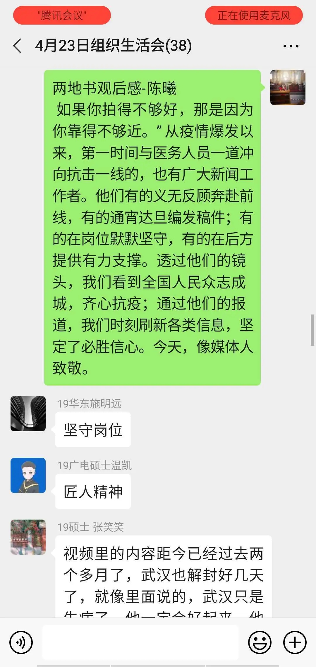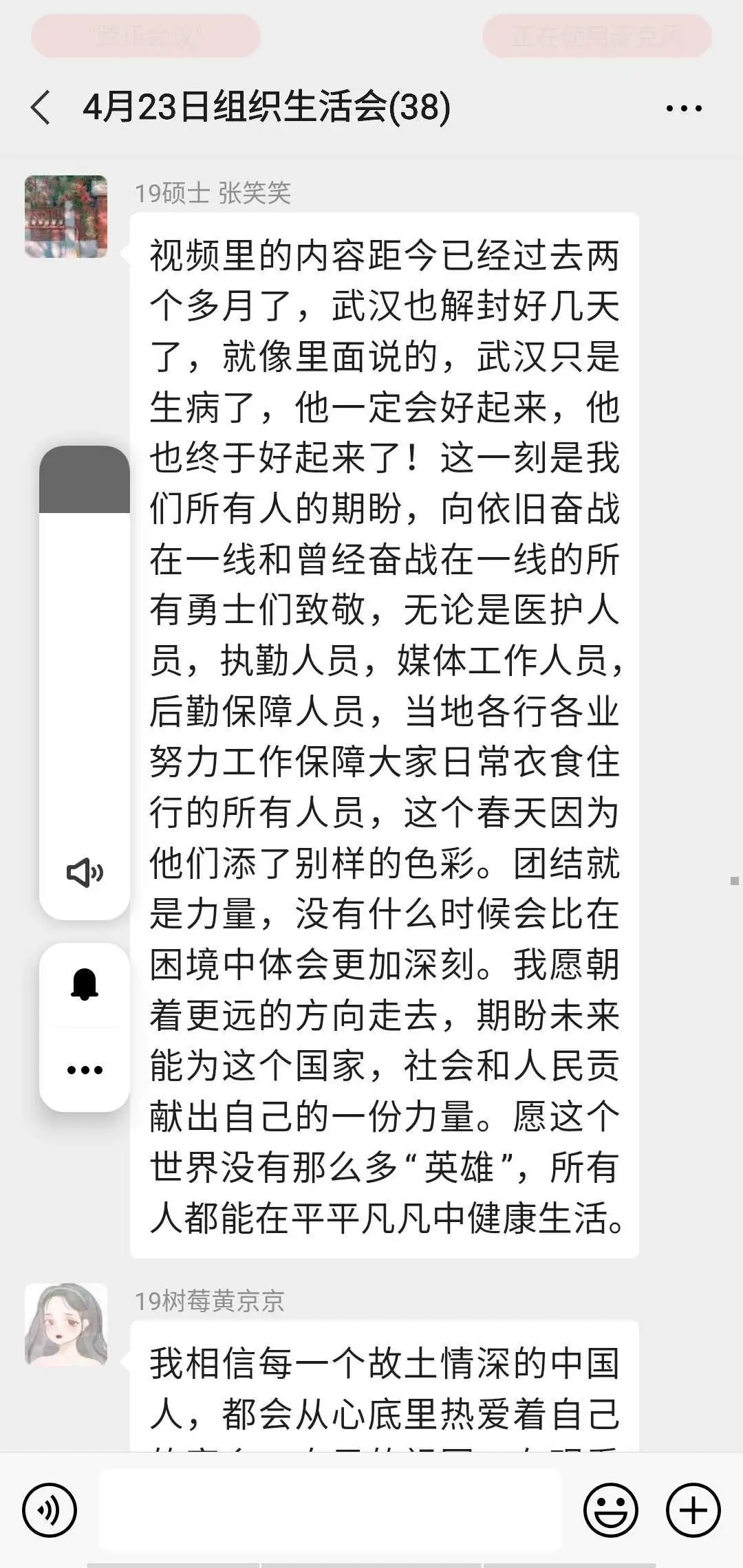 响应停课不停学,各党支部线下利用学习强国平台,自学党史国史,观看战疫情特别节目《两地书》,并在线上主题活动时进行留言讨论。《两地书》是由CCTV-6电影频道和武汉广播电视台联合出品的打赢疫情防控阻击战特别节目,从电影人的角度,写信给武汉的前线英雄们。观看节目后同学们结合自身专业特点在支部微信群中展开积极讨论。