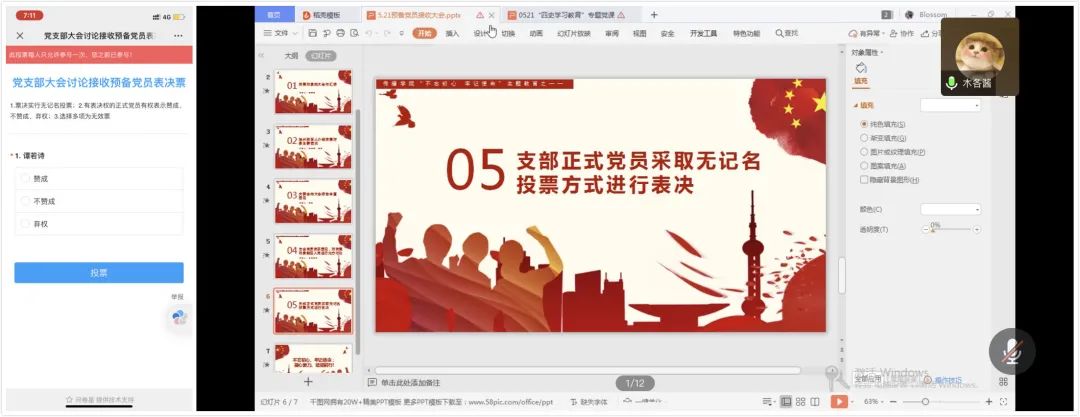 最后,在针对发展对象的讨论结束后进行了线上无记名投票表决。每位党员同志本着认真严肃公正公开的原则,认真履行了党员义务。本次大会依次执行了上述五项内容,严格遵守了发展党员的程序与流程。最后,周明明同志报告了投票结果,大会对谭若诗同志的赞成人数均超过应到会有表决权正式党员的半数,同意接收其为预备党员。