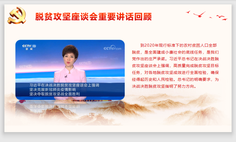 这一部分,党员们一起学习了习近平总书记脱贫攻坚金句:“小康不小康,关键看老乡”、“脱贫攻坚是干出来的”、“找到贫根,对症下药”.......以及习近平总书记在决战决胜脱贫攻坚座谈会上的重要讲话。党员们了解到2020年是全面建成小康社会目标实现之年,也是全面打赢脱贫攻坚战收官之年。脱贫攻坚已经进入决战决胜关键期,加快推进各地区脱贫攻坚,不能有任何懈怠。