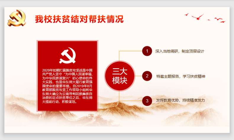 自2019年8月教育部脱贫攻坚工作领导小组将华东师大确立为云南寻甸回族彝族自治县的定点扶贫单位之后,华东师大提前行动,积极谋划。学校将结对帮扶工作划分为三大模块:深入当地调研,制定顶层设计;特邀主题报告,学习扶贫精神;发挥教育优势,持续精准发力。通过主持人的介绍,党员们对我校对口帮扶工作的具体情况有了更深入的了解。
