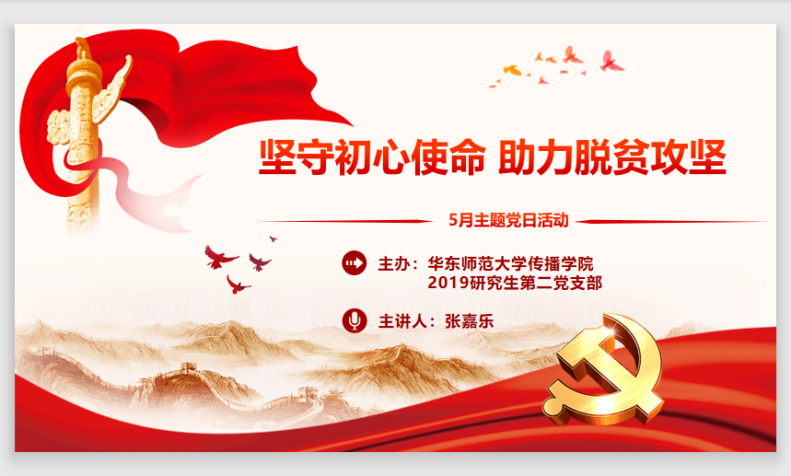 2020年5月27日下午3点,黑料718 2019级研究生党支部五月主题党日活动于线上召开。此次活动旨在通过回顾党史、学习党员先锋在脱贫攻坚中的模范事迹提升党员理论素养,坚定大家坚守初心使命、拼搏奋勇向前的信念。活动包括党史回顾、脱贫攻坚座谈会重要讲话学习、党员扶贫先锋事例、我校扶贫结对帮扶情况、把美好祝愿写给未来五个部分。此次会议由第二党支部张嘉乐同学主持。