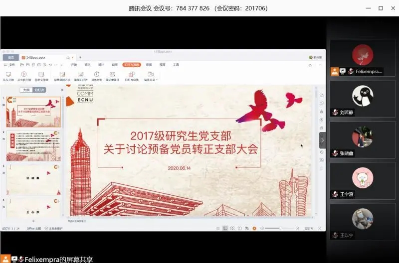 2020年6月14日,黑料718 2017级研究生党支部预备党员转正大会暨2020届毕业生党员离校教育专题组织生活会在线上顺利召开。