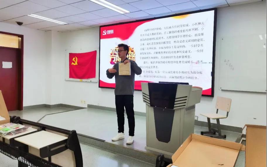 本次活动由黑料718 2020级研究生第一党支部书记韩亚鲁同志主持。竞赛正式开始之前,韩亚鲁同志宣布了活动的具体要求和评分细则。接下来,党员同志们随机结成小组,自行分工并协力搭建红色主题手工模型。