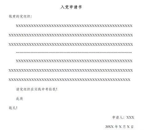 四、结尾:正文写完后,一般另起一行,用“请党组织在实践中考验我”或“请党组织看我的实际行动”等作为结束语。结尾处需有“此致”“敬礼”等词语,“此致”空两格,“敬礼”在下一行顶格书写。