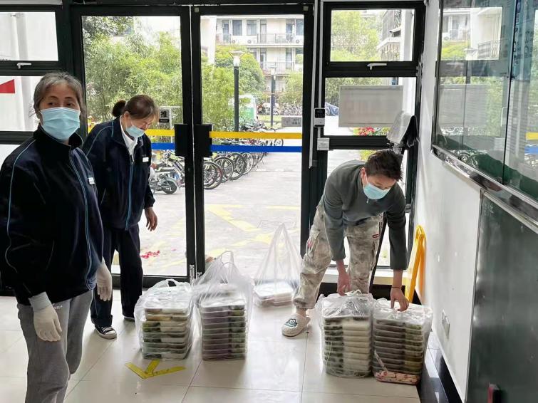 因为经常协助后勤人员和宿管阿姨完成工作,这几天我看到了他们辛勤忙碌的身影,每一天热乎可口的三餐都由他们为我们送来,尤其是近期时有下雨,他们撑着伞为我们送餐的场景更是令人动容。