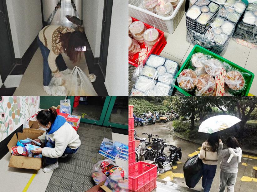 从1人到300多人逐渐壮大的“虹梅南路学生党员志愿者之家”,每层楼自发形成的楼层志愿者小分队,核酸检测、物资配送、三餐发放等多条工作线在全校师生的协同合力之下紧张有序地进行着。我作为楼层长,日常工作除了分发三餐和回收垃圾,还需要统计各种数据、清点配送物资等,帮助解决同学们的生活需求。“封楼”后的前几天,所有的事情都需要亲历亲为,但随着越来越多的楼层志愿者加入,大家根据自己的时间填写了分工表,每天到了发饭、回收垃圾的时间点时,志愿者们都会积极主动地完成任务。