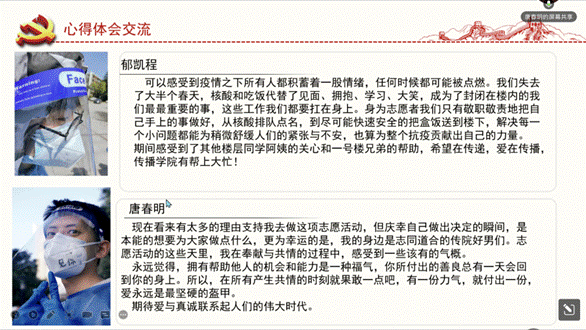之后,来自两个支部的三名党员志愿者代表分享抗“疫”经历。