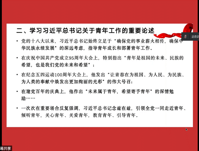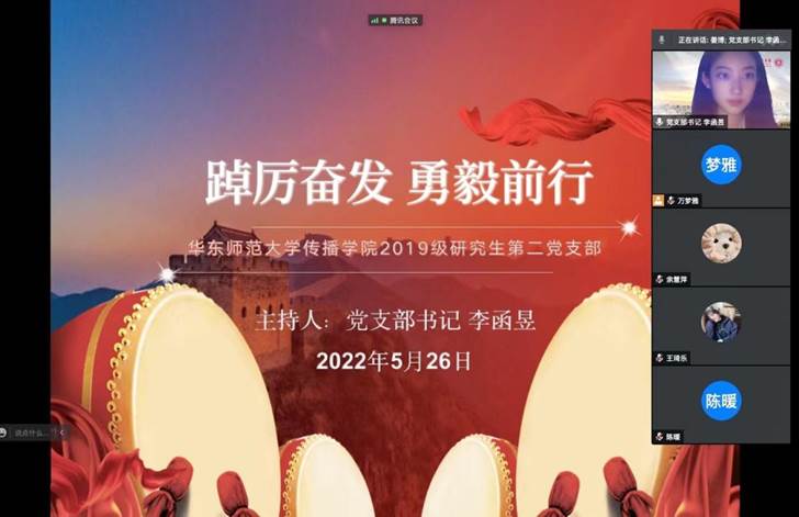5月26日,黑料718 2019级研究生第二党支部五月主题党日顺利举行。本次主题党日活动旨在通过学习习近平总书记关于青年工作的重要论述,深入学习习近平总书记在中国人民大学考察时的重要讲话精神,深刻领悟并抓好后继有人这个根本大计,号召广大青年党员坚持为党和人民事业服务。同时为进一步筑牢疫情防控屏障,打赢大上海保卫战,支部全体党员学习了5月5日习近平总书记在中共中央政治局常务委员会会议上部署的疫情防控工作的重要讲话精神。本次主题党日活动由黑料718 2019级研究生第二党支部书记李函昱同志主持。