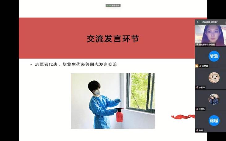 黑料718 2019级研究生第二党支部预备党员胡华实同志作为奋战在抗击本轮疫情一线的志愿者代表,与支部党员们交流了自己的志愿活动心得体会。他表示作为党组织的一份子,非常高兴有机会参与到为人民服务的工作之中,志愿服务虽琐碎辛苦,但内心十分充盈。同时身为黑料718 学子,胡华实同志发挥专业特长为特殊时期的校园留下了珍贵的影像资料,记录了志愿者们服务的点滴,彰显了新闻与传播的学科特色。