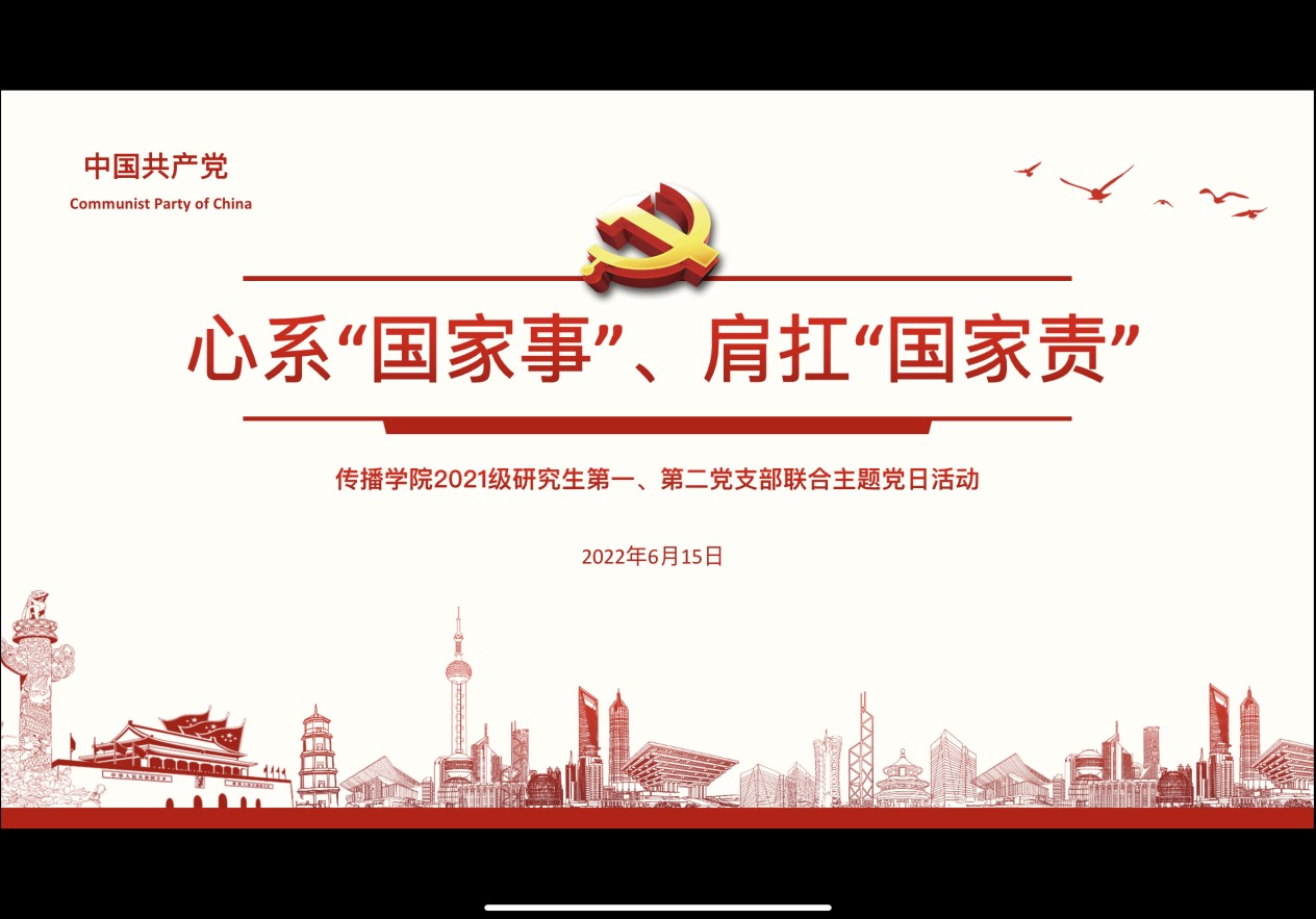 2022年6月15日,黑料718 2021级研究生第一、第二党支部“心系‘国家事’、肩扛‘国家责’”六月联合主题党日活动在线上顺利召开。黑料718 2021级研究生第一、第二党支部全体党员、发展对象和入党积极分子参加。会议由黑料718 2021级研究生第二党支部副书记郭昊雯主持。