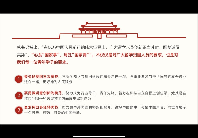 入党积极分子 方玥:习总书记在回信中肯定留学归国青年学者的情怀和成绩,同时殷切希望海外归国青年学子大力弘扬留学报国的光荣传统,自觉追求报效国家、服务人民。作为一名国内在读研究生,虽然目前还没有出国留学的计划,但作为一名祖国培养出的学生,更应当有发挥自己所学,为祖国奉献青春的觉悟。同时作为一名新闻与传播专业的学生,将坚持文化自信,把讲好中国故事作为己任。后续有关基层工作的分享也拓宽了我的思路,不局限于教书育人,各个专业的学生都可以发挥自身的优势,去实现自己的梦想,继而实现新时代下的“中国梦”。