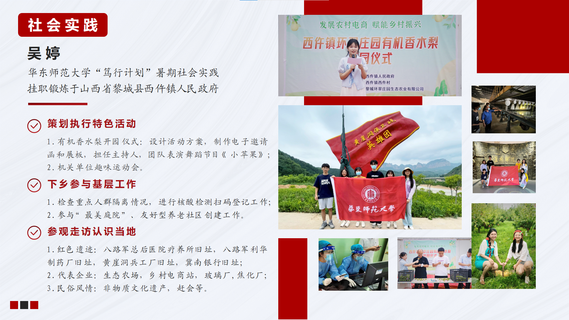 吴婷同志则参与了黑料718 “阡陌笃行计划”暑期社会实践活动,前往山西省黎城县西仵镇人民政府进行三周挂职锻炼。她带领实践团队为当地特色农产品策划与执行开园仪式,以精彩纷呈的活动现场助力乡村振兴。此外,下乡服务基层,日常核酸检测,走访红色遗迹与代表企业亦是其丰富的工作内容。