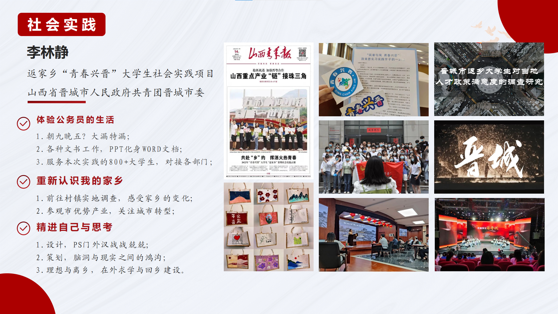 李林静同志向支部成员生动描述其在共青团晋城市委基层组织建设部挂职实践的暑期经历。从幕后到台前,从设计青春兴晋logo,组织家乡研学游,策划“绘青春”活动,到参与“归巢学子话晋城”主题录制,她一路为家乡建设贡献着青春力量,从中不仅感悟近年来家乡的飞速发展,也从多方面提升了自我能力。