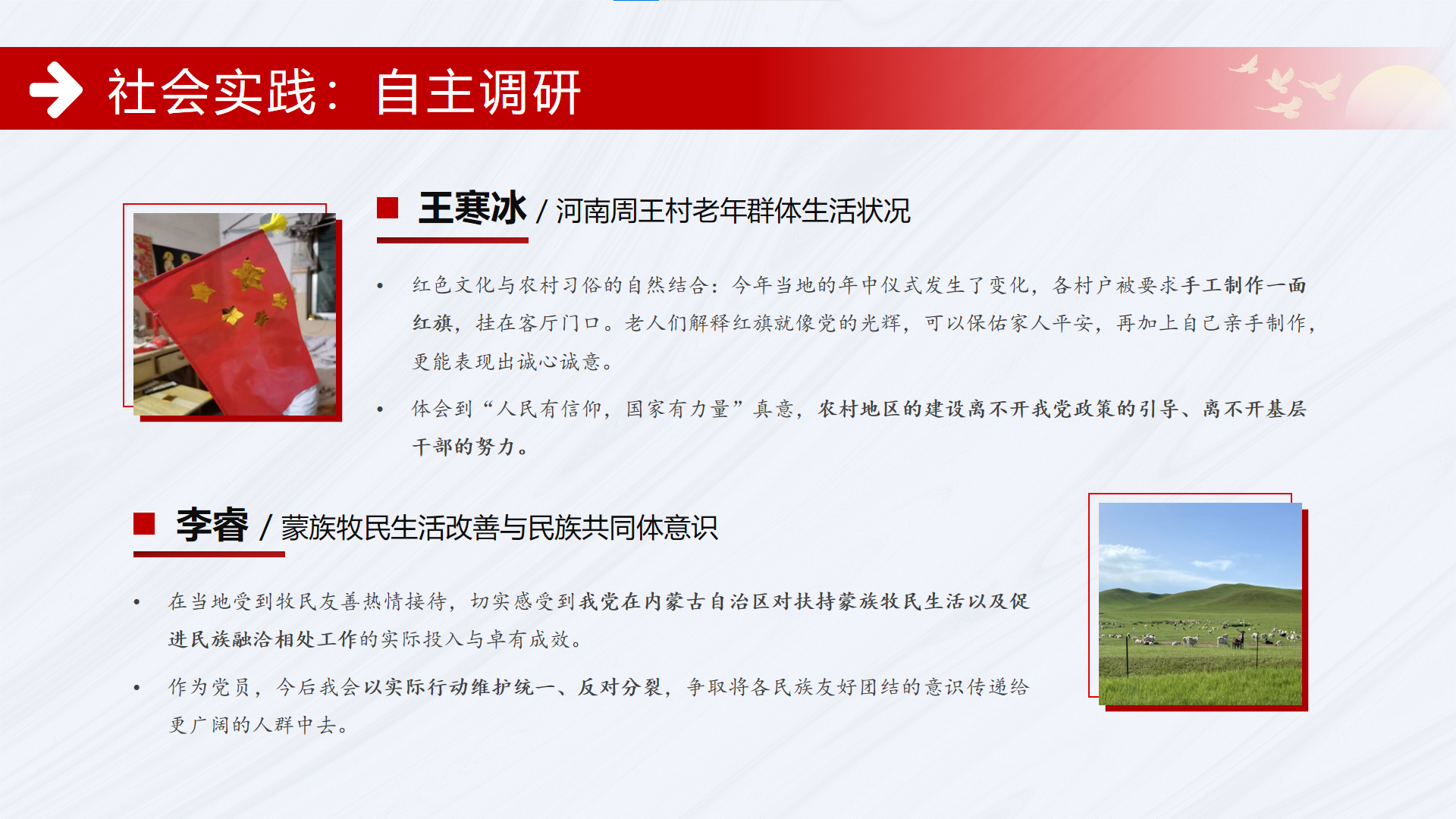 除挂职锻炼外,另有王寒冰、李睿两位同志分别前往河南省周王村、内蒙古自治区克什克腾旗对当地群体生活状况进行实地调研,感受国家政策和党员干部对当地发展的重要性。