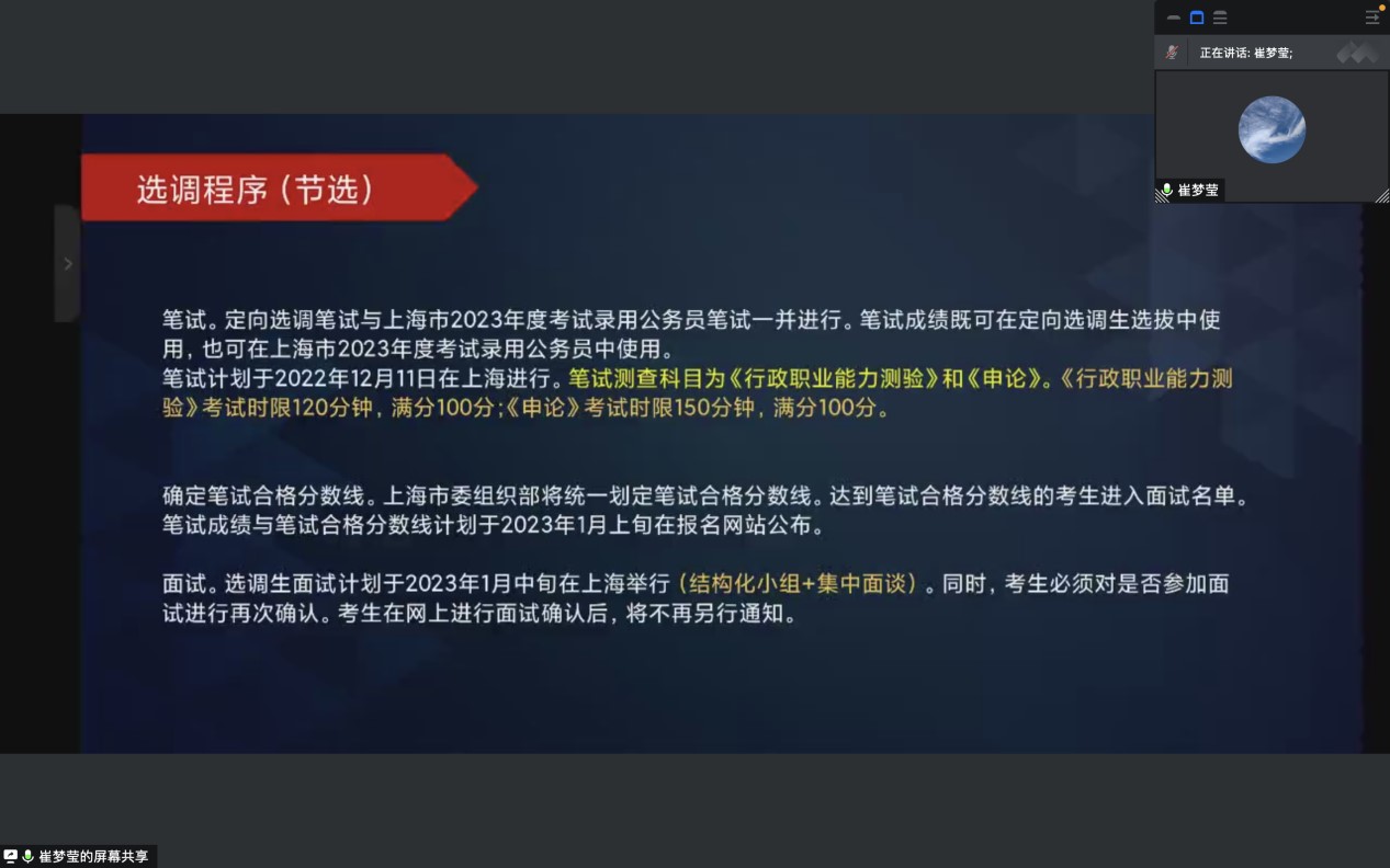 另外,崔梦莹学姐针对笔试和面试也提出了自己的一些建议。在笔试方面,学姐建议要提前准备,多练习。备考之中可以先通过网课找到学习基本套路,之后再开始分模块刷题,找自己的薄弱项和问题,最后可以计时刷套题。同时,崔梦莹学姐建议同学们平时应多多关注时事新闻和上海市政府报告。今年报考的同学一定要认真阅读二十大报告,并且应将其和时事新闻相结合。在面试方面,崔梦莹学姐补充建议大家要有充分的自我认知,要学会自我推销,把握住展示自己的机会;可以关注“上海大调研”等相关公众号进行学习。