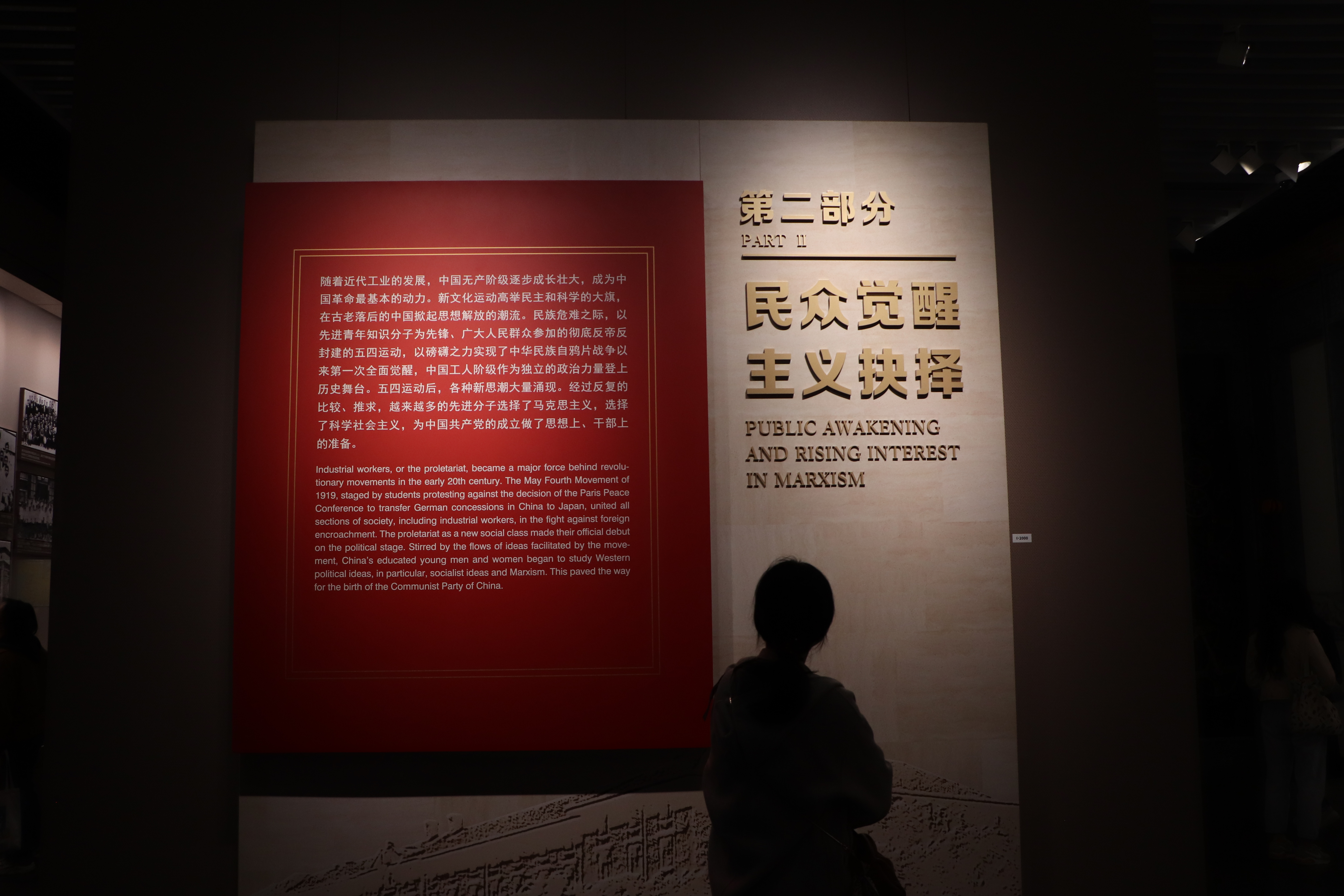 展厅内不仅有大量的文物实物、图片图表、油画雕塑,实景还原,甚至还有多媒体声像等展示手段,全方位还原了中国共产党诞生历程中的重要场景、人物和物品,同时也让新传专业的同学们感受到了不同媒介特质带来的感官震撼。