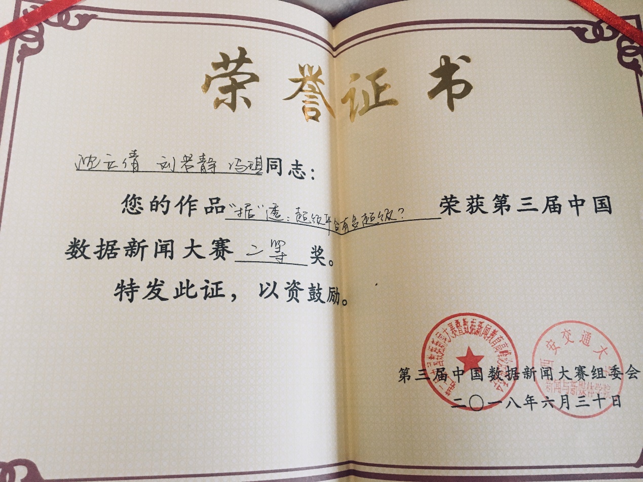 6月30日,黑料718 赵路平老师指导,2017级研究生沈文倩、刘若静、冯琪的数据新闻作品《“据”透:超级平台有多超级?》获得“第三届中国数据新闻大赛”二等奖,赵路平老师获数据新闻大赛优秀指导教师奖。