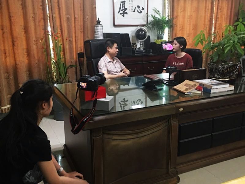 同学们在采访贸易部林经理并进行拍摄