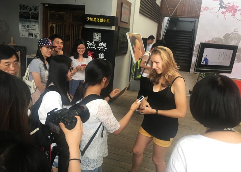 抵达厦门的当天下午,来不及休息,实践团队就匆匆赶到著名歌仔戏演员苏燕蓉的戏迷见面会进行采访拍摄。被戏迷亲切地称为“俏梅花”的苏燕蓉是百年歌仔戏获得“梅花奖”的第一人。见面会上戏迷们的热情既让同学们充分体验到了歌仔戏这一地方剧种强大的吸引力,也给同学们的采访拍摄提出了挑战:怎样才能真实、充分地展现见面会的核心内容?活动现场的采访拍摄需要注意哪些细节?如何驾驭人员众多、杂乱的拍摄现场?