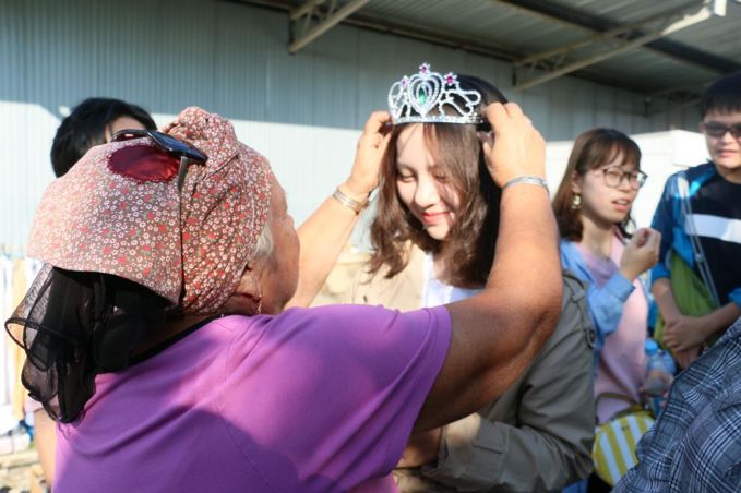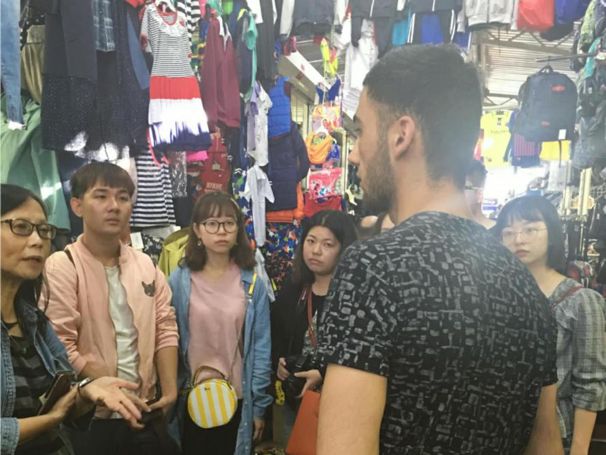大家首先来到一家当地颇为常见、以服务周围居民为主的农贸市场,这里主要售卖日常生活所需的蔬菜、水果和服饰等生活用品,充满了生活气息,是了解当地居民日常生活的一个重要窗口。一开始大家对在这种环境下如何开展采风调研有点无从下手,随着张翠容老师与摊铺店主们热情的打招呼,亲自示范在语言不通的情况下,怎样运用简单的英语和生动的肢体语言与当地人交流,大家也开始大胆尝试。特别是在农贸市场旁边的旧货摊铺上,大家通过Ruslan的帮助深入了解了一位年近80岁、曾是苏联时期公务员的老太太的故事,对于普通老百姓的生活有了感性的理解。