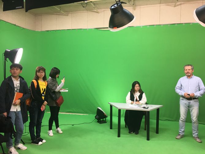 8月23日,实践团队来到喀山大学新闻系进行交流访问。新闻系副主任Karimov Ildar首先介绍了喀山大学新闻系的基本情况,并特别提到该系最大特色是强调理论学习与实践的紧密结合,拥有全俄唯一的大学创办的公共电视台——Univer TV,新闻系学生从入学起便可在其中参与制作媒体作品,优秀学生还可拥有毕业后直接进入电视台工作的机会。在新媒体中心主任Dautova Reseda的陪同下,师生实地考察了Univer TV的虚拟演播室和脱口秀录制厅。