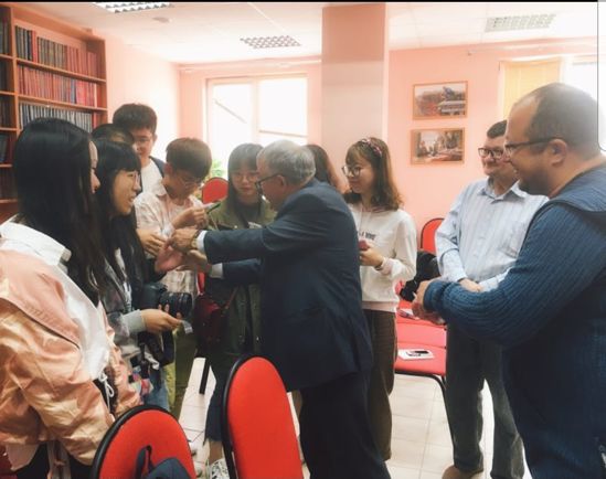 支部书记Khafiz Gayazovich特别介绍了自己亲身经历过的苏联解体前后苏共解散重新组织成为俄共的历史,他表示:“我很羡慕中国,能够坚持发展社会主义并取得了辉煌成就。”他还向实践团队师生赠送了俄罗斯共青团成立百年的纪念勋章以及俄共党徽。
