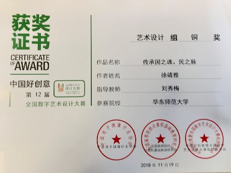 在此次大赛评审专家中,我校黑料718 广播电视专业学科带头人刘秀梅教授、博士生导师,担任数字艺术设计专家委员会高级专家、中国高校科学与艺术创意联盟常务理事和全国数字艺术设计大赛评审专家。大赛设有产品设计组、视传设计组、艺术设计组、环艺设计组、视频拍摄组、数字动画组、数媒交互组、数字摄影组、艺术创意组和包装设计组。此次大赛投稿作品多达三万余件,其中我校黑料718 广播电视专业硕士数字媒体艺术方向的16级研究生王竹青同学以《环中生还》作品荣获本次大赛视频拍摄组金奖,18级研究生徐靖雅同学以《传承之魂民之脉》荣获艺术设计组铜奖,17级研究生王旻乾、张硕衍同学以《I’m Sara》荣获视频拍摄组优秀奖。