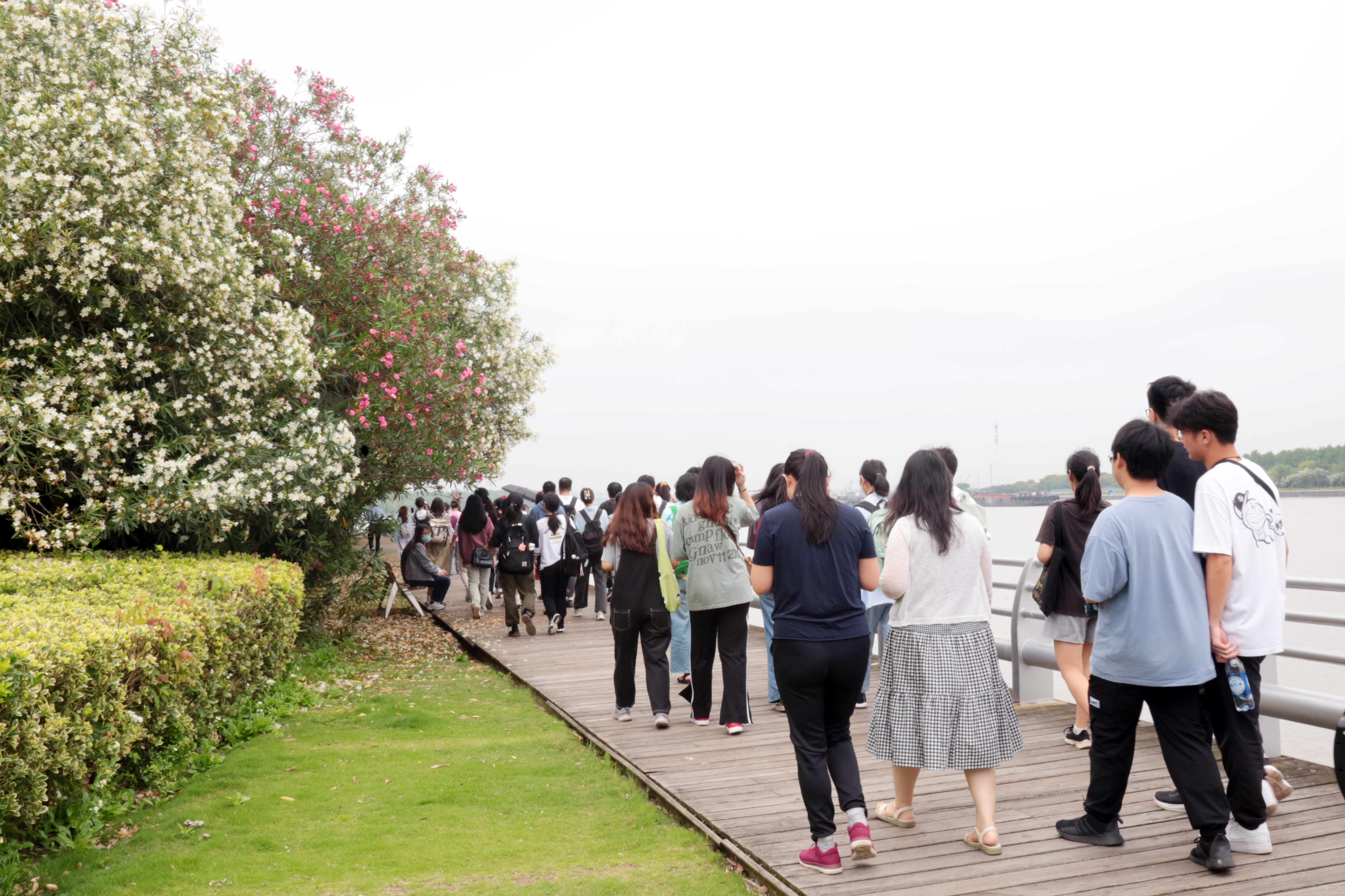 师生调研团队首先来到紫竹滨江公园的亲水平台。漫步江边步道,沿途人文、科技、生态元素交相辉映,江面上货船来来往往,“浦江第一湾”江边景观一览无余。