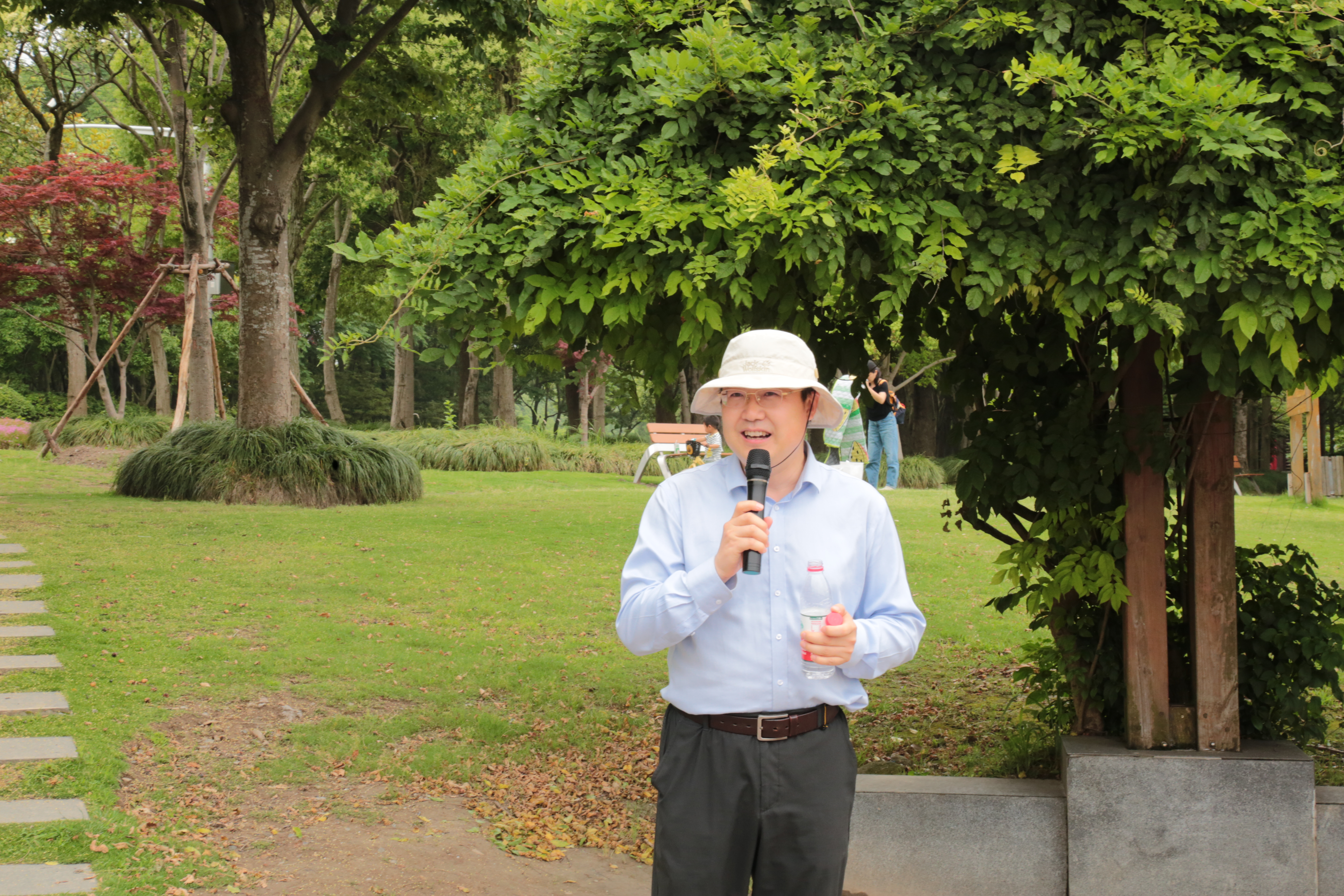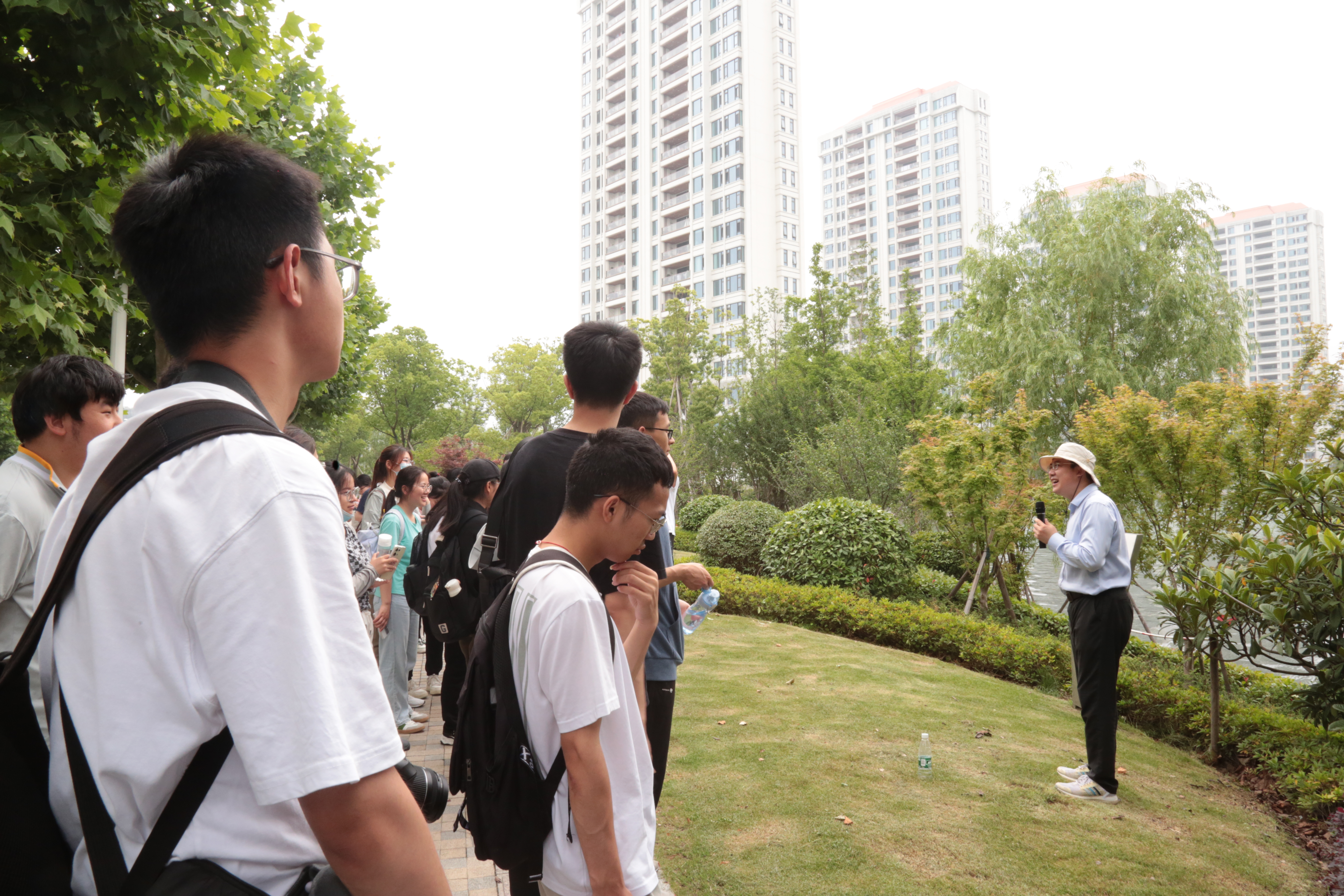最后,师生调研团队来到兰香湖。兰香湖水面积40公顷,是闵行区最大的人工湖,扩展了浦江第一湾滨江生态通廊的延展性和开放性。在兰香湖边,张勇老师介绍了兰香湖设计和建设过程、生态清洁小流域及宜居小区理念。随后,师生沿湖徒步行走,通过身体力行学习校门口的生态环境新知识。