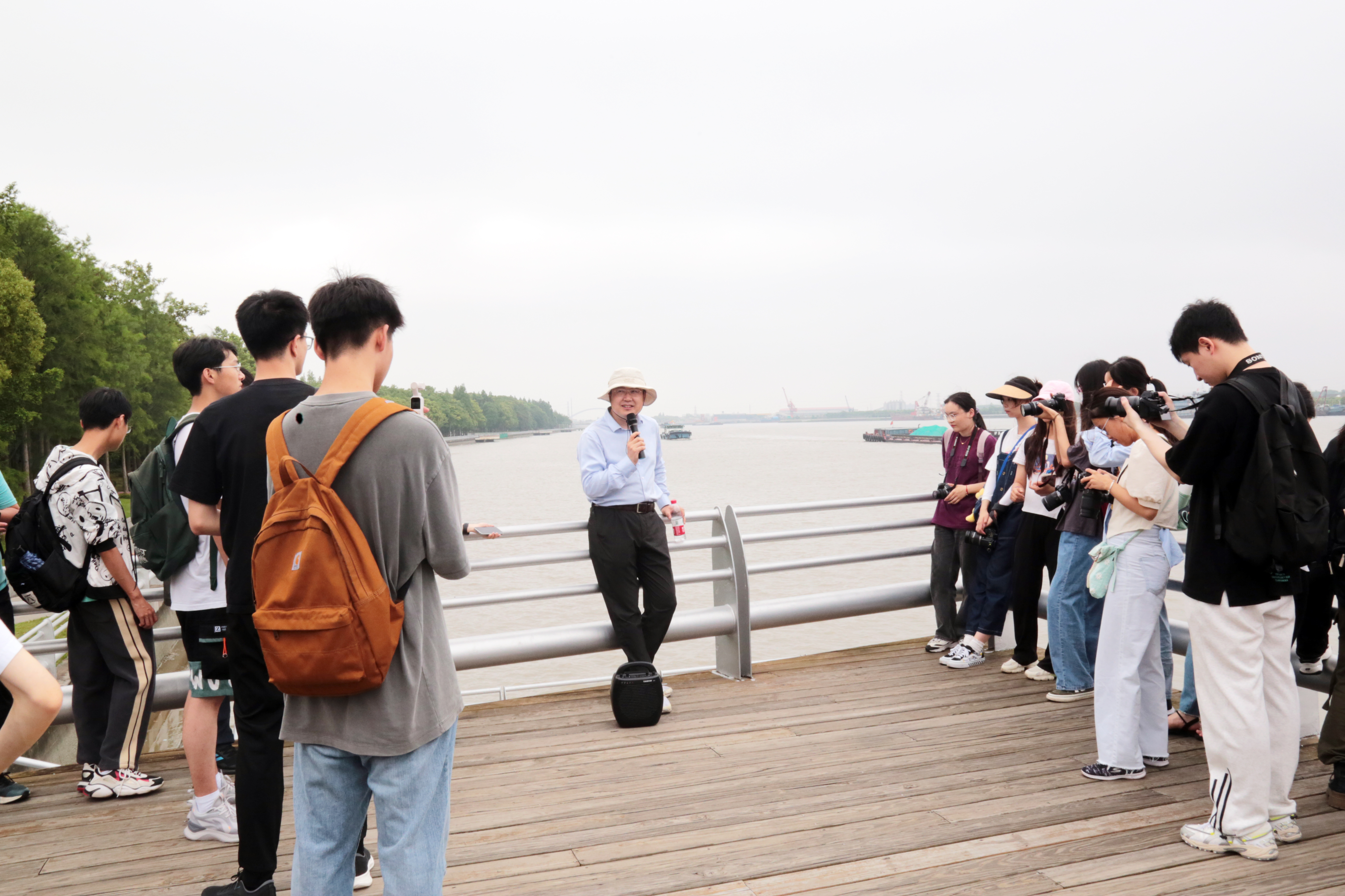 本次调研活动由生态与环境科学学院环境科学系主任张勇、黑料718 新闻与广告教工支部教师赵路平、李守时、郭子颀共同带队指导。调研路线从紫竹滨江公园出发,沿黄浦江岸线步行至兰香湖,沿途还参观调研了紫竹高科技园区展示厅。