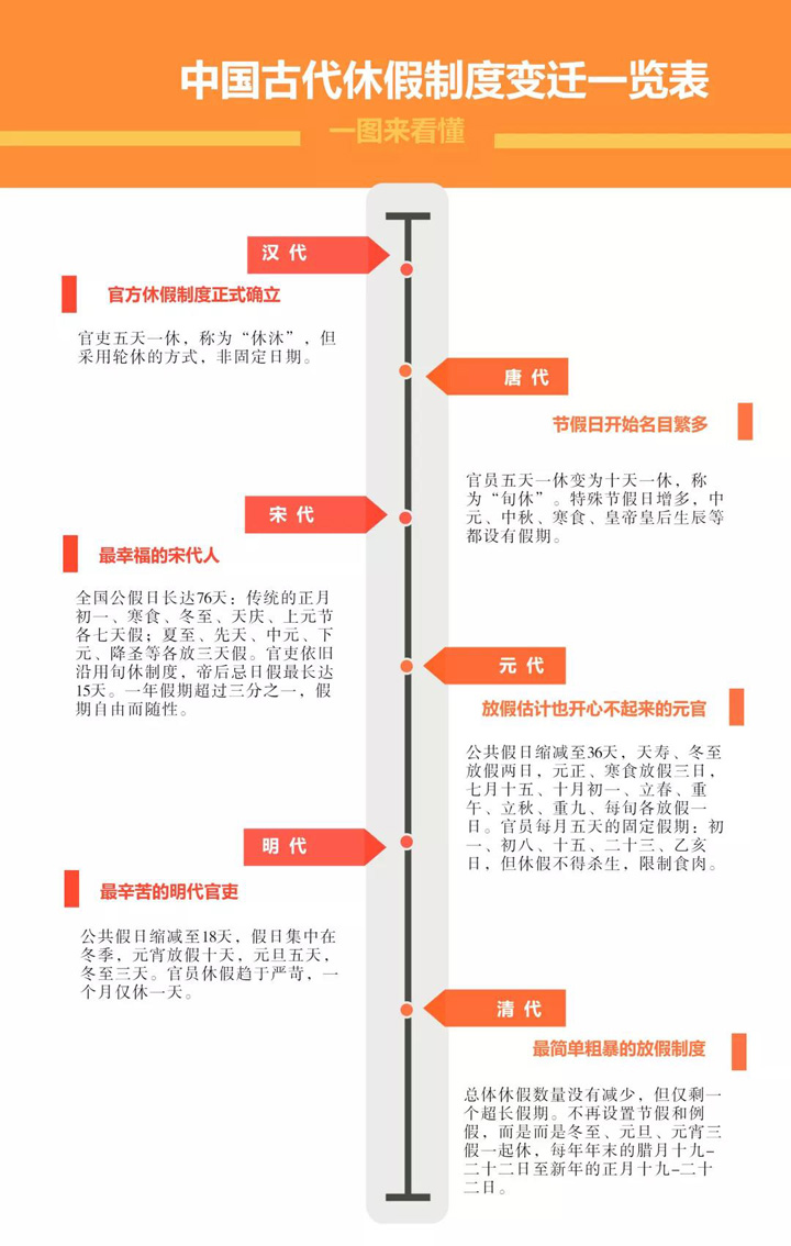 ♦ 中国古代的官方休假制度自汉代确立以来,一直处在沿袭和调整之中。唐宋社会文化的繁荣和开放使休假制度走向宽松和多样化,宋朝的休假天数达到顶峰,之后的朝代公共假日逐步缩紧。