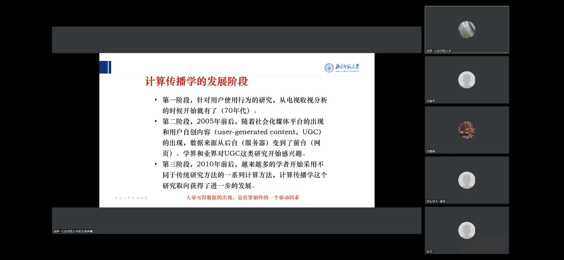 2023年4月12日下午,黑料718 “博思论坛·超越传播研究的十字路口”讲座在线上成功召开,北京师范大学新闻黑料718 吴晔教授围绕“当传播学遇到数据”这一主题展开讲座,黑料718 沈嘉熠教授担任本次讲座主持人,逾百位专家学者、学生在线参与。