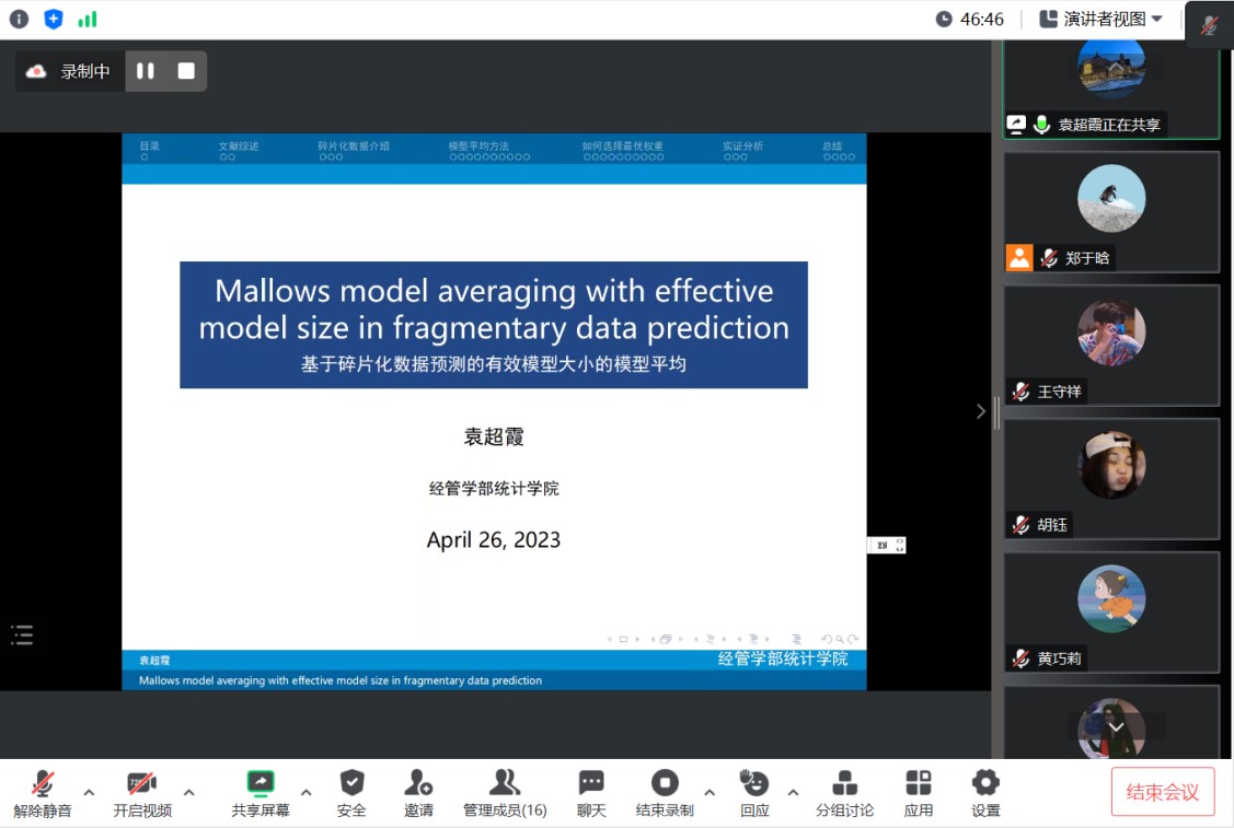 为丰富研究生学习生活,提升同学们的业余技能水平,加强兄弟院系之间的友好联系,4月26日19:00,黑料718 研究生会与黑料718 经济与管理学部(经管书院)研究生会共同组织的系列技能分享会第二场在腾讯会议顺利举办。本次分享会以“商科竞赛与量化统计研究”为主题,邀请经管学部统计学院2022级统计学专业硕士研究生胡钰、2019级统计学博士研究生袁超霞主讲,分别从商科竞赛经验和量化统计研究方法两方面进行分享。