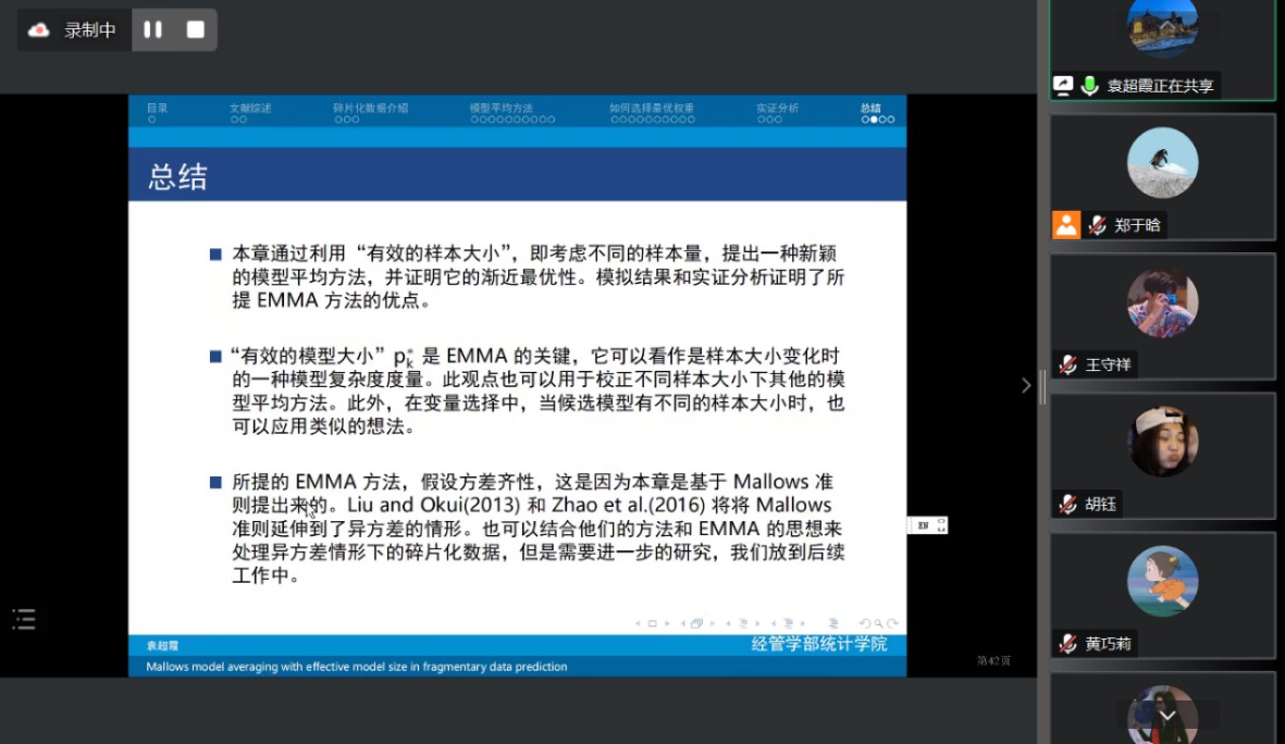 下半场分享则由袁超霞同学对“碎片化数据”下的线性模型平均方法进行介绍。袁超霞同学首先简要介绍了不同模型的适用情境和选择依据,并指出在实际数据分析过程中,单一的模型选择往往会导致对其他模型信息的忽略,也难以适用于不同的数据样本,而模型平均则是弥补单一模型选择缺陷的一种有效方法。模型平均就如同把鸡蛋分散开来放在不同的篮子中,能够整合各种候选模型的信息。