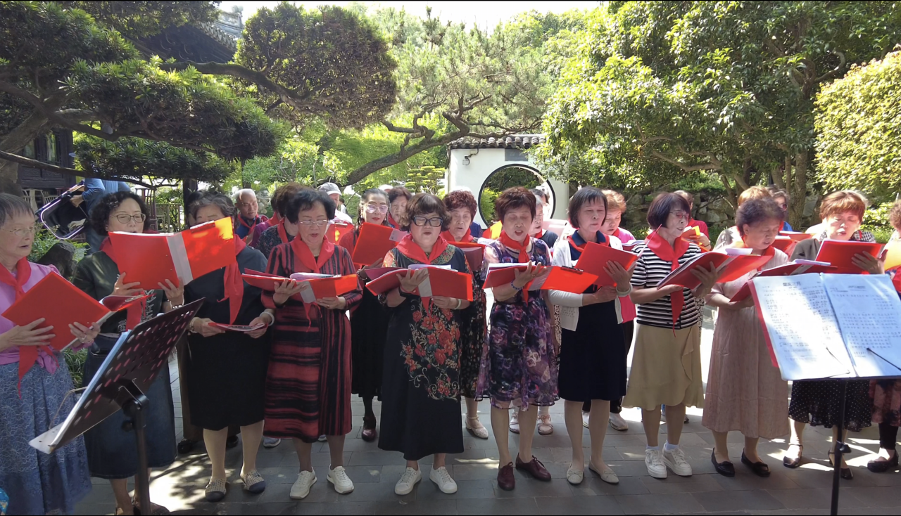 桂林公园“歌声嘹亮”合唱团合唱画面