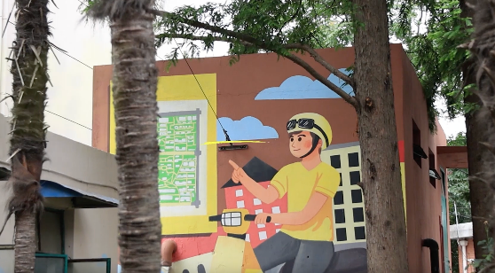 第一次前往开鲁二村拍摄,我们一下车便隔着马路远远看见了社区门口张贴着的“骑手社区友好地图”。走进社区,一路上五彩缤纷的卡通墙绘,也彰显着浓厚的骑手友好氛围。温暖——这是我们对开鲁二村的第一印象。