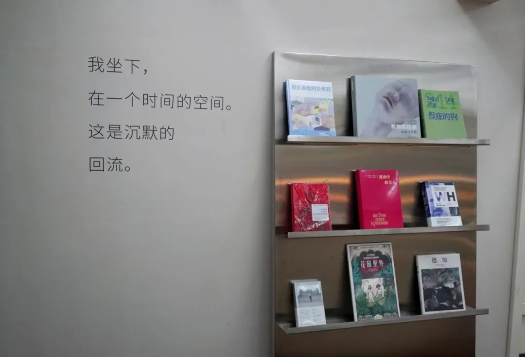 书店主要由三层构成。一层全部用来存放诗集,根据对诗集的感受来分类和摆放。进门两侧的“人间松弛指南”和“坐在你身边看云”区域,放满了轻松好读的诗集;往里走是“夜幕低垂”和“别着急读完”区域,这里的诗集需要读者花上更多时间反复品读。二层除了淘来的旧诗集,还有文学小说和艺术画册,同时也陈设了桌椅以便阅读。下沉空间则是阅读休息区和定期更新的展厅。阅读区放置了高矮各异的桌椅和能把人完全包裹的懒人沙发,为读者提供多种不同的舒适选择。
