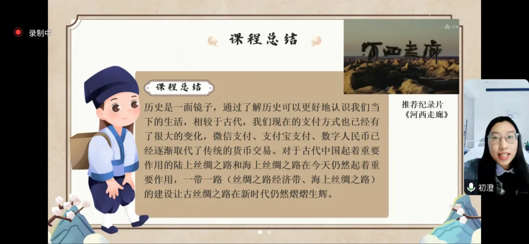 在课程进入尾声时,刘老师带着同学们总结回顾课程内容,推荐并介绍了与课程内容相关的视频学习资源,学生可通过课下的学习进一步了解古代中国贸易发展的历史。在最后,刘老师讲述自己对于历史学习的理解,希望提升同学们对于历史学习的兴趣。
