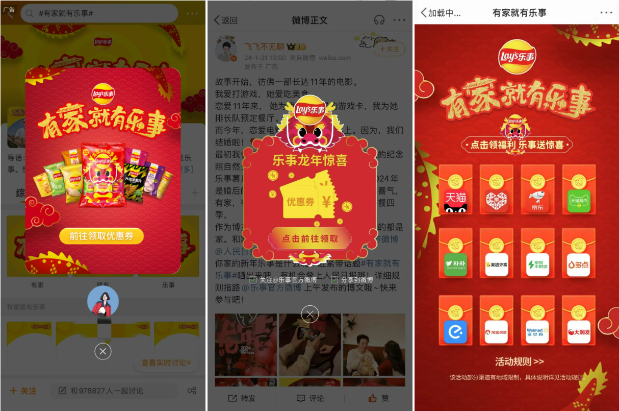 在确定营销主阵地时,百事食品团队经过多维度评估后选择了微博。从消费者体验看,微博的图文互动方式门槛较低,更易于消费者展现全家福的温馨画面;从活动传播看,无论是牵头方人民日报,还是乐事的明星代言人和意见领袖,均在微博拥有较大影响力,更利于活动的扩散;从生意转化看,品牌可在微博搭建汇聚多渠道的“优惠券墙”,使项目在获得曝光度的同时,也把消费者引导向了货架。这一决策不仅使项目获得了更高的曝光度,也有效提升了项目的传播效果。
