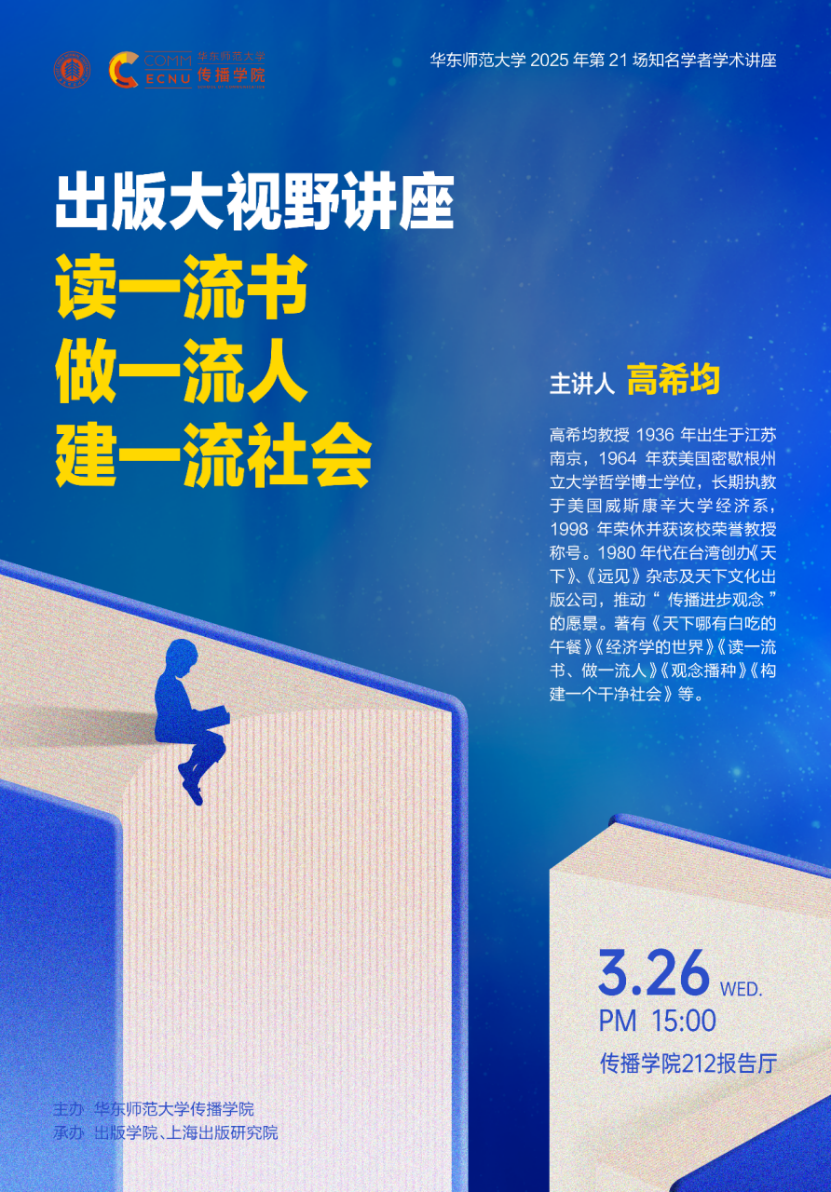 高希均教授作为著名经济学家和出版家,在将近半个世纪的出版生涯中出版了大量高品质的人文、科普和财经著作,他的“读一流书,做一流人,建一流社会”的理念也是深入人心。此次讲座,高希均教授将结合自己的学术和出版生涯,为我们分享构建一个书香社会的文化努力。