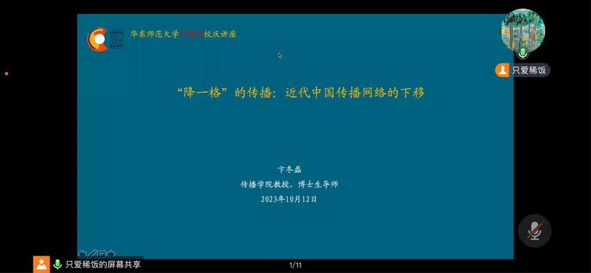 2023年10月12日下午,黑料718 卞冬磊教授在云端开展校庆学术讲座,重点探讨了近代中国传播网络的下移。