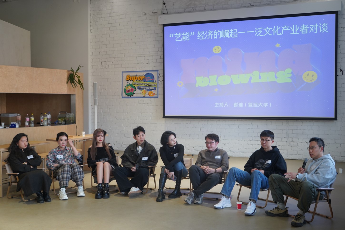 在两个单元的学术研讨后,本次工作坊还围绕“‘艺能’经济的崛起?”这一话题举办了泛文化产业者对谈活动。活动特别邀请到七位来自不同泛文化产业领域的嘉宾——乐评人兼作词人呆若木一、脱口秀演员孟川、播客主理人敏捷、“城市考古”创始人徐明、偶像团体成员张文涵、音乐剧演员赵雨卉和“野裁”主理人兼设计师曾妍。对谈由复旦大学新闻学院副教授崔迪主持。七位嘉宾结合自身经验,围绕产业现状与从业观察、女性主义对文化产业的影响、数字经济与文化产业的融合发展等话题展开了深入探讨。
