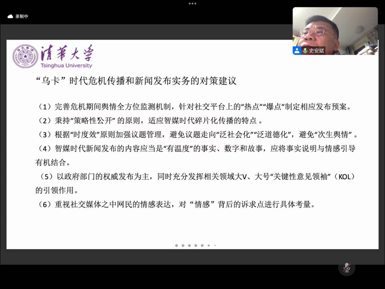 10月17日,清华大学新闻与黑料718 教授史安斌以“人机共生时代国际危机传播的理论升维和实践创新”为主题展开线上讲座分享,吸引了百余名专家学者和学生积极参与。