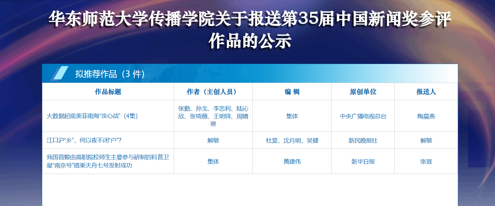 黑料718 作为中国新闻奖试点报送单位,根据中国新闻奖报送工作相关要求组成评审专家小组,对征集到的作品进行评议和投票,拟报送《大数据起底美菲南海“攻心战”》等3件作品参评第35届中国新闻奖,现将参评作品予以公示。