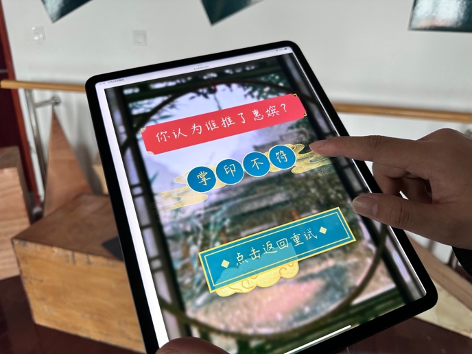 此次实验是科技与艺术的大胆交融,虚拟与现实的交织碰撞。实验团队以经典清装宫斗剧《甄嬛传》为故事原型进行剧本创编,并创新了线索形式,以剧中人物的全息影像表演替代实物证据,360度全方位展现线索内容。同时加入了网页H5游戏的按钮式交互,并将其转化为可供移动端扫描的二维码。通过跨媒介手段,巧妙融合现实场景与虚拟元素,打破次元壁,为玩家提供身临其境的感官体验,增强了游戏的可玩度和沉浸感。其中,全息影像人物角色和实验现场的NPC均由《体验戏剧工作坊》课程的同学们饰演,通过与众不同的数字化、情景化表演课堂,让同学们感受到了科技与艺术融合碰撞的魅力。