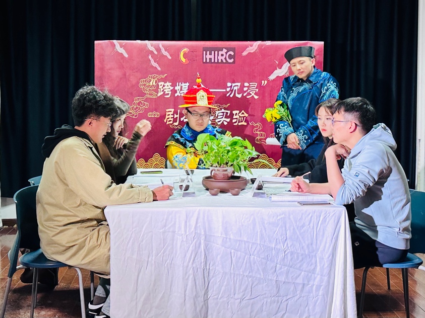 此次实验是科技与艺术的大胆交融,虚拟与现实的交织碰撞。实验团队以经典清装宫斗剧《甄嬛传》为故事原型进行剧本创编,并创新了线索形式,以剧中人物的全息影像表演替代实物证据,360度全方位展现线索内容。同时加入了网页H5游戏的按钮式交互,并将其转化为可供移动端扫描的二维码。通过跨媒介手段,巧妙融合现实场景与虚拟元素,打破次元壁,为玩家提供身临其境的感官体验,增强了游戏的可玩度和沉浸感。其中,全息影像人物角色和实验现场的NPC均由《体验戏剧工作坊》课程的同学们饰演,通过与众不同的数字化、情景化表演课堂,让同学们感受到了科技与艺术融合碰撞的魅力。